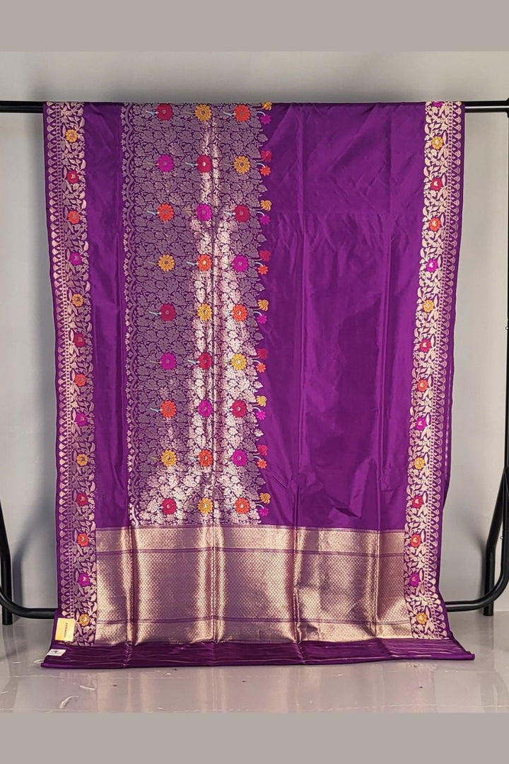 Elevate your ethnic wardrobe with this exquisite Katan Silk Saree in regal purple. This designer piece showcases intricate minakari work paired with lustrous zari embellishments, creating a stunning interplay of color and craftsmanship. The luxurious silk fabric drapes beautifully while the detailed embroidery adds sophistication to every occasion. Perfect for celebrations and formal events, this saree combines traditional artistry with contemporary elegance.